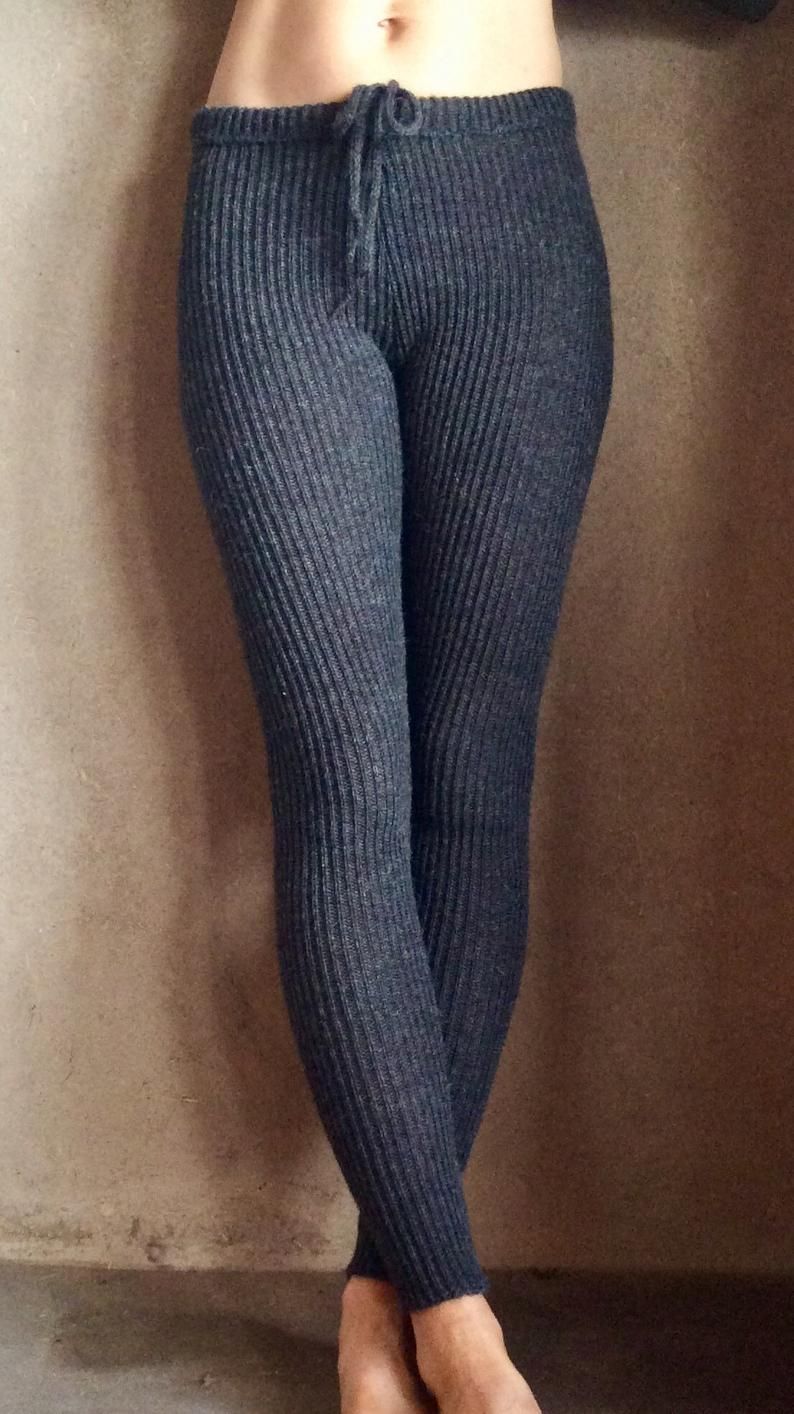 Inspired by 80s fashion but with a modern twist, the “Dallas” pants are knit from the top down with baby alpaca yarn, making them soft and comfortable to wear directly on your skin. Unlike most of the knitted pants in this list, these pants are knitted flat in two panels until the pockets, and in the round using stockinette stitch afterwards.