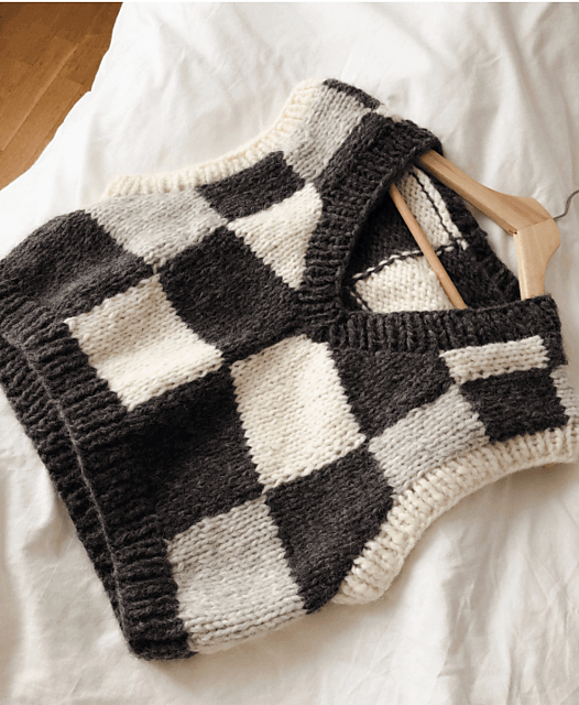 If you’re a beginner, you’ll find chunky cropped V-neck vests that can be knit with big needles in a week or so. If you’re more advanced, there are oversized and intarsia sweater vests that will keep you knitting for a while longer.