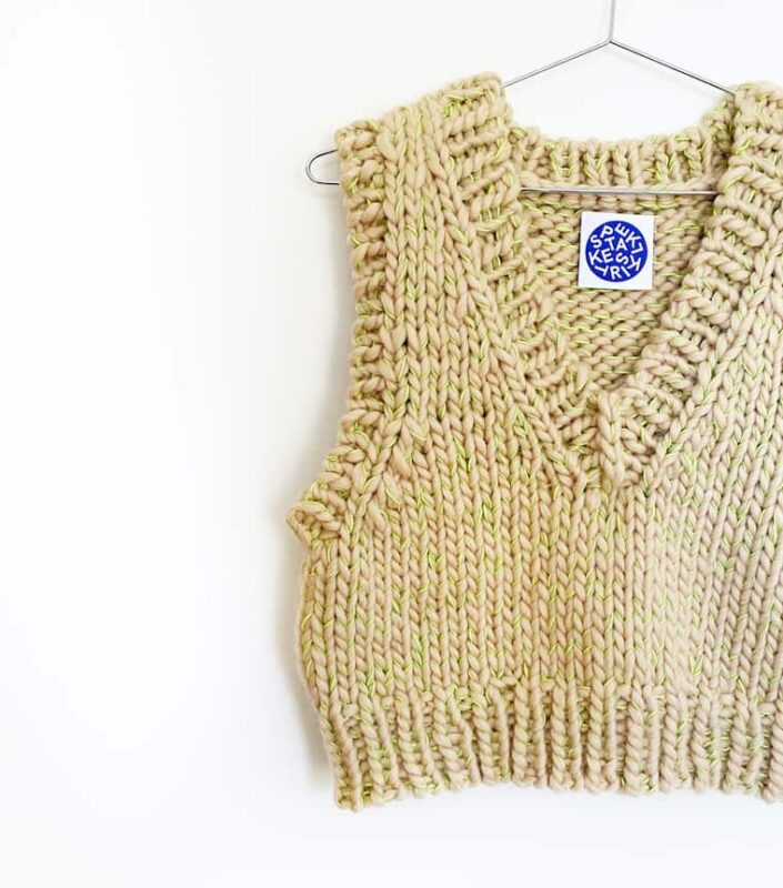The “Treasure Vest” is a beginner-friendly knitting pattern for a sleeveless knitted vest with a cropped fit and a deep V-neck. It is worked from the top down and requires no finishing work apart from weaving in the ends. Available in sizes XS to XXL, the vest is knit with 8mm needles using stockinette stitch and measures roughly 49cm to 59cm in length.