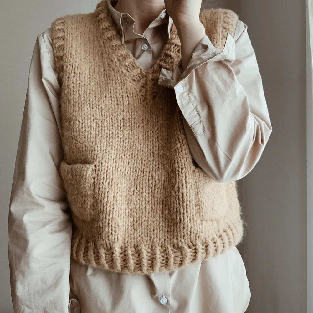 Inspired by vintage menswear, ‘Vest No. 2’ is an oversized V-neck vest pattern that is knitted using stockinette stitch and two strands of yarn. The slipover is first worked from the top down in three panels, which are then closed together to knit the rest of the body in the round.